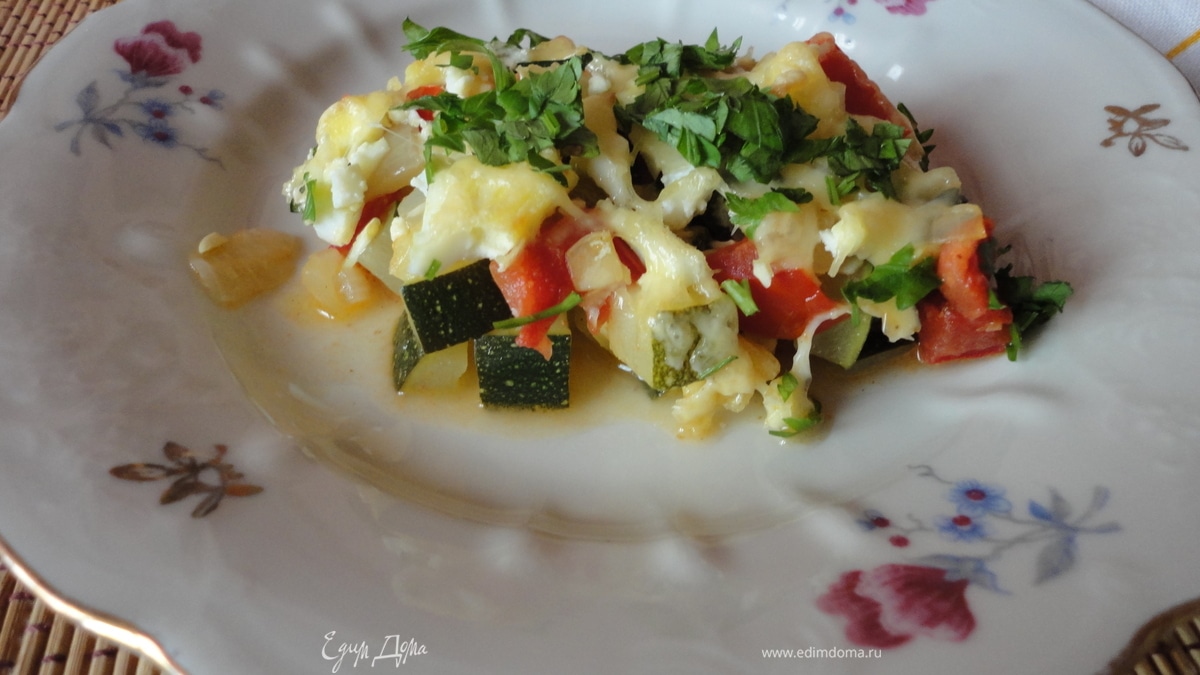 В блюдо для запекания выложить овощи, сверху посыпать рубленым яйцом, затем сыром, полить растительным маслом и запекать в духовке 10 минут. При подаче на стол посыпать зеленью.