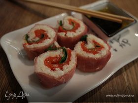 Выложить рядами начинку с одной стороны. Свернуть с помощью бамбукового коврика, немного прижать. Всего получилось 6 таких колбасок. - Шаг 8