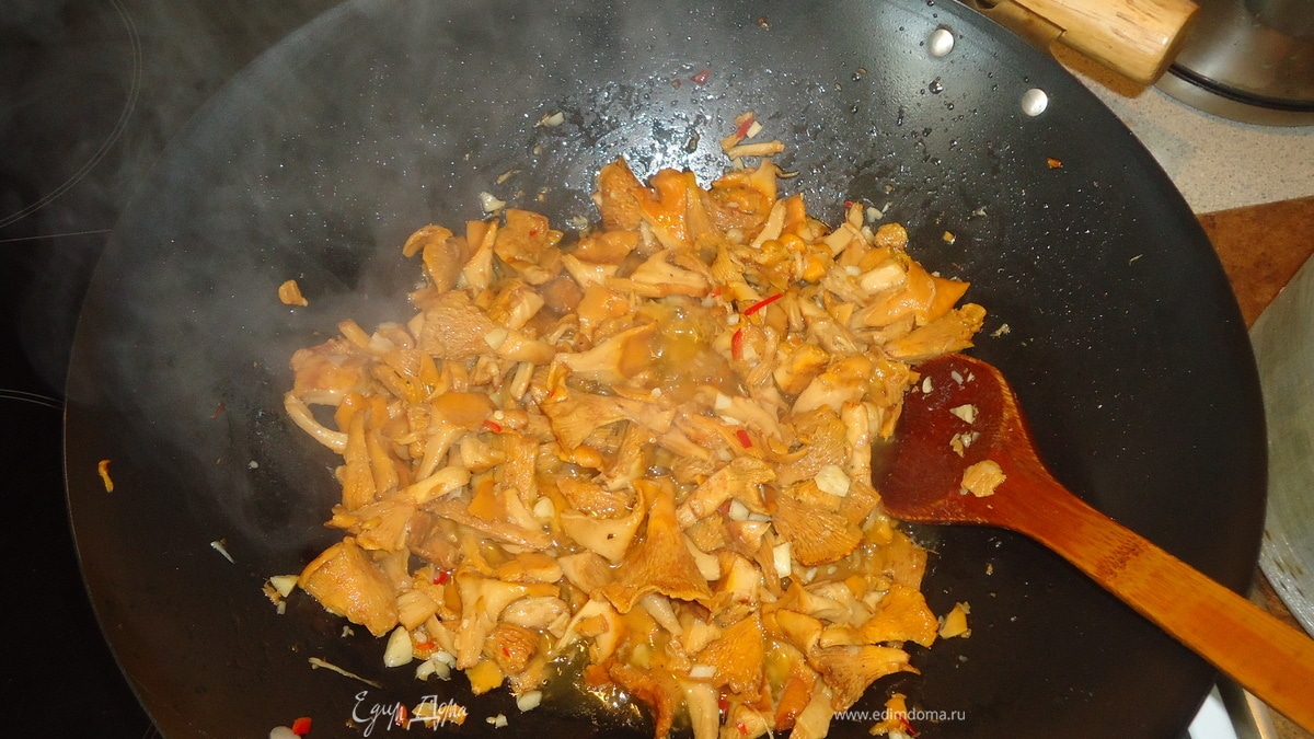 - Шаг 2Перец чили очищаем от семян, режем мелко и добавляем к грибам.