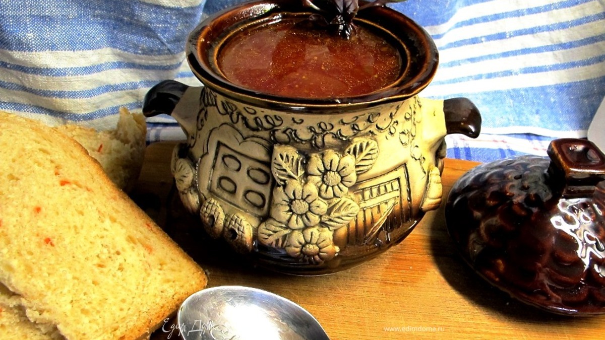 Светлана, отдаю долг. Готовила это борщ уже много раз, ( этот рецепт прочно обосновался на моей кухне) но фото выставляю только сейчас. Очень вкусно! С баклажаном и без капусты - это наш вариант. Томлю долго, в последний раз поставила в 9 утра и ушла на работу. Пришла в 14.00 и с порога поняла что борщ готов. Такой аромат на весь дом! Спасибо!🌸