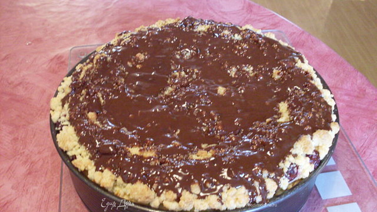 - Шаг 1200 гр. масла растопить. Муку 450 гр., 200 гр. сахара, пол чайной ложки разрыхлителя, щеп. соли, 1 яйцо смешиваем, добавляем жидкое масло и сделать крошку. Половину крошки поставить на холод. Другую половину уложить в форму и сформировать корж. В горячей духовке пропечь 20 мин. Потом остудить примерно 15 мин. С 1 банки вишни слить сок. 5 яиц и 225 гр. сахара взбиваем. Добавляем 750 гр. творога, 250 гр. маскорпоне, 1 п. ван. пудинга-порошок. Хорошо размешиваем до однородной массы. Выкладываем массу на остывший корж. На верх выкладываем вишню. Остатком крошки засыпаем. И выпекаем ещё час и пятнадцать минут. Если будет сильно зажариваться, закройте ал. фольгой. В форме остудить. В 100 мл. сливок растопить 100 гр. шоколада, снять с плиты и добавить 25 гр. кокосового жира, дать ему там растаять. Покрыть глазурью пирог. Посыпать какао. Температура: 175 гр.
