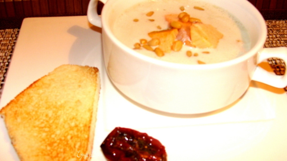Разобрать на перышки, выложить порционно в тарелочки, залить сырной массой. Сверху бросить немного кедровых орешков. - Шаг 5