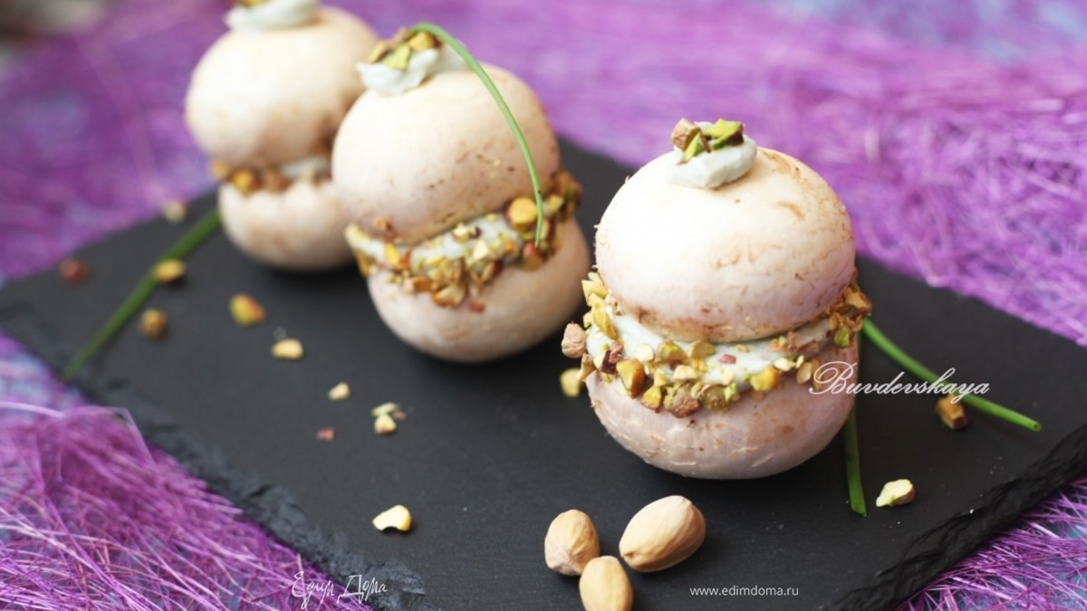 На одну шляпку шампиньона выложить крем, накрыть второй шляпкой, слегка надавив, чтобы крем выступил снаружи и обсыпать крем рубленными фисташками. ENJOY !