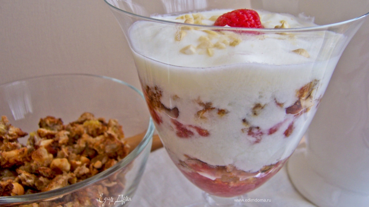 Для завтрака: в чашку или креманку послойно переложить гранолу с йогуртом (либо взбить творог со сметаной). Можно добавить свежие фрукты (у меня клубника, перетертая с сахаром). Приятного аппетита!