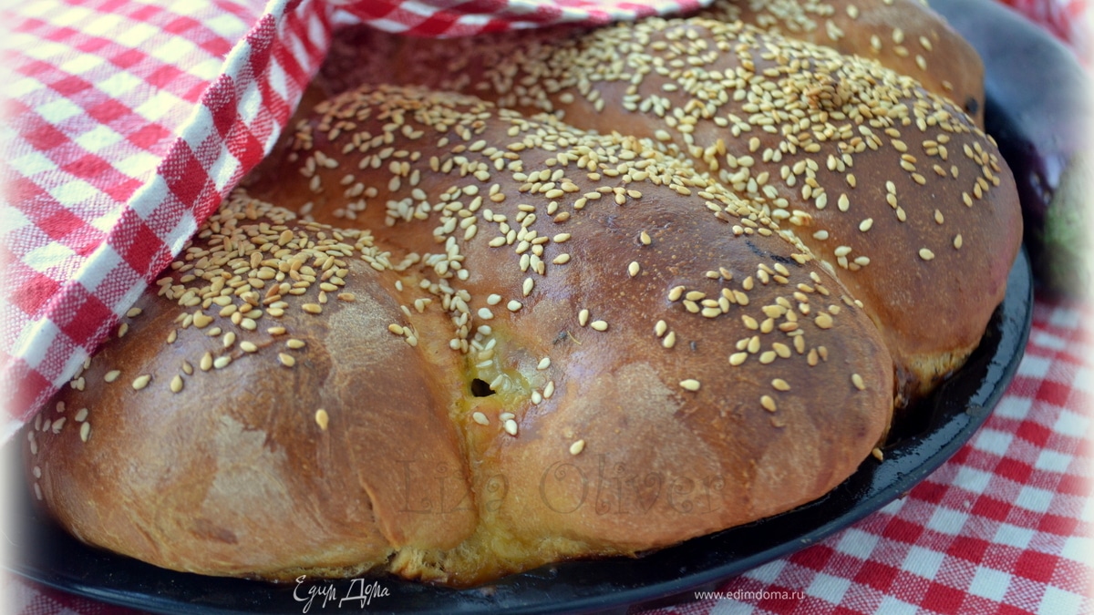 Смазать кисточкой желтком с молоком, посыпать кунжутом и отправить в духовку на 1 час при 180 гр. Я выпекала на середине духовки. Если начнет сильно румяниться - прикрыть фольгой в 2 слоя.