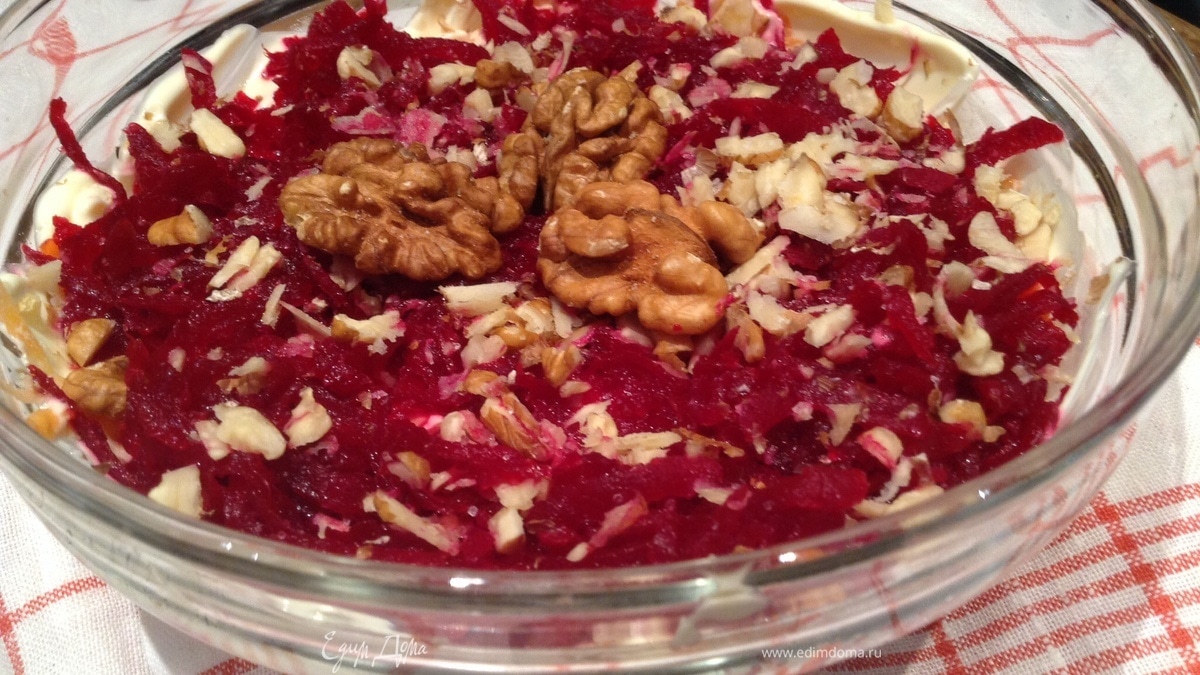Мясо порезать на мелкие кусочки. - Шаг 2Укладываем слоями: мясо, лук (нарезанный полукольцами), майонез, морковь (свежая, натертая на крупой терке), майонез, свекла, орехи)