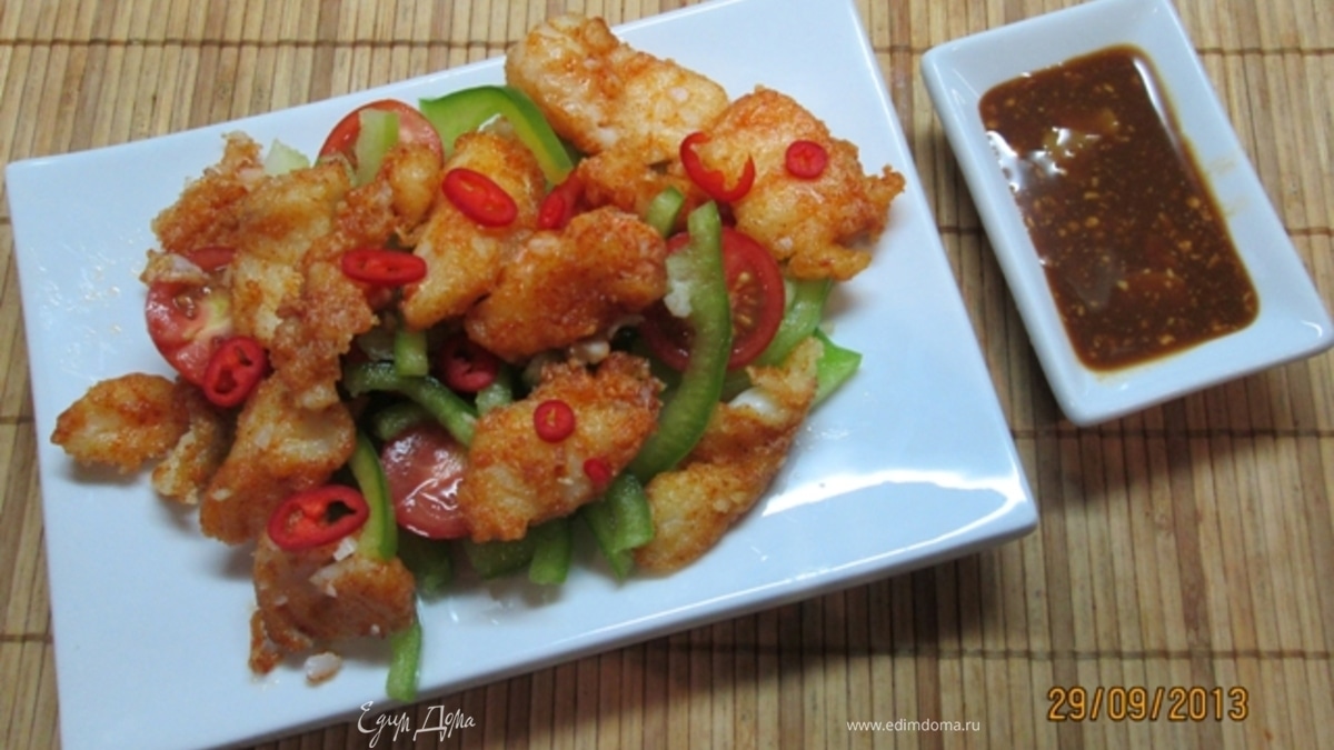 Обвалять рыбу в смеси муки, крахмала, паприки. Для соуса соединить соевый соус с горчицей и чесноком. - Шаг 3