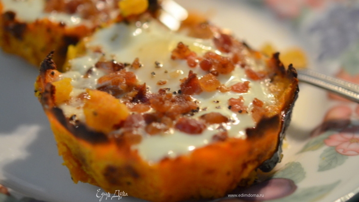 Разбить по яйцу в каждую ячейку. Посолить и поперчить. Сверху выложить обжаренный предварительно бекон, поломать в крошку. Вернуть в духовку на 15 мин. - Шаг 4