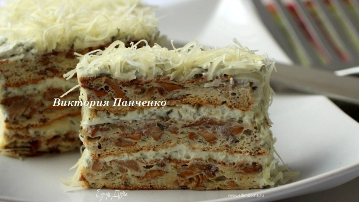 Закусочный бисквитный торт с лисичками, творожным кремом и сыром Джюгас