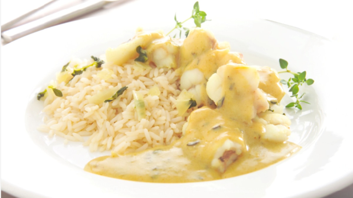 Деликатесное изысканное рыбное блюдо из припущенного морского черта с тимьяном, кокосовым молоком и дижонской горчицей Maille Dijon Originale, подаваемое с рисом.