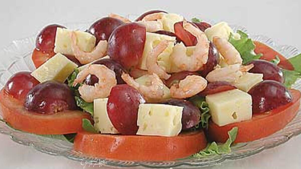 - Шаг 1Помидор нарезать кружочками и выложить по краям блюдца. (Блюдца небольшие порционные) Листья салата нарезать полосками, уложить вдоль кружочков помидора, сверху разместить нарезанный кубиками сыр и половинки виноградин без косточек. Креветок обжарить в 1 ст. ложке масла, охладить и положить в центр блюдца. Посолить, полить уксусом и оставшимся маслом. Можно положить и в одно блюдо побольше.