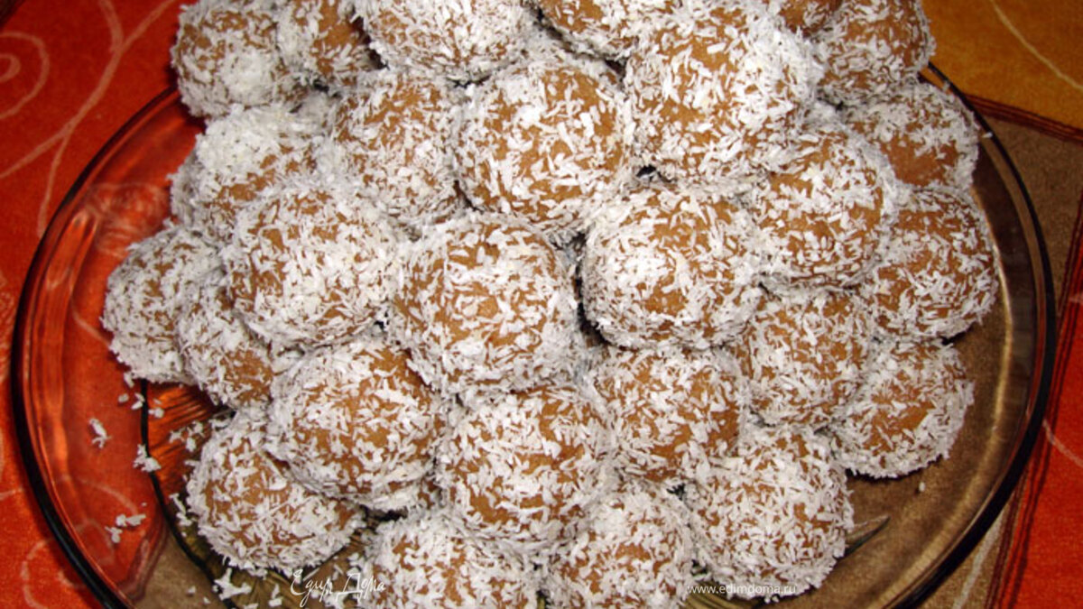 - Шаг 1Сгущеное молоко варим 2 часа на водяной бане. Масло надо размягченное, но не растопленное. Овсяное печенье размалываем в очень мелкую крошку. Масло слегка взбиваем с вареной сгущенкой. Выкладываем этот крем в размолотое печенье, тщательно вымешиваем. Из теста скатываем маленькие шарики, обкатываем их в кокосовой стружке... Приятного аппетита!