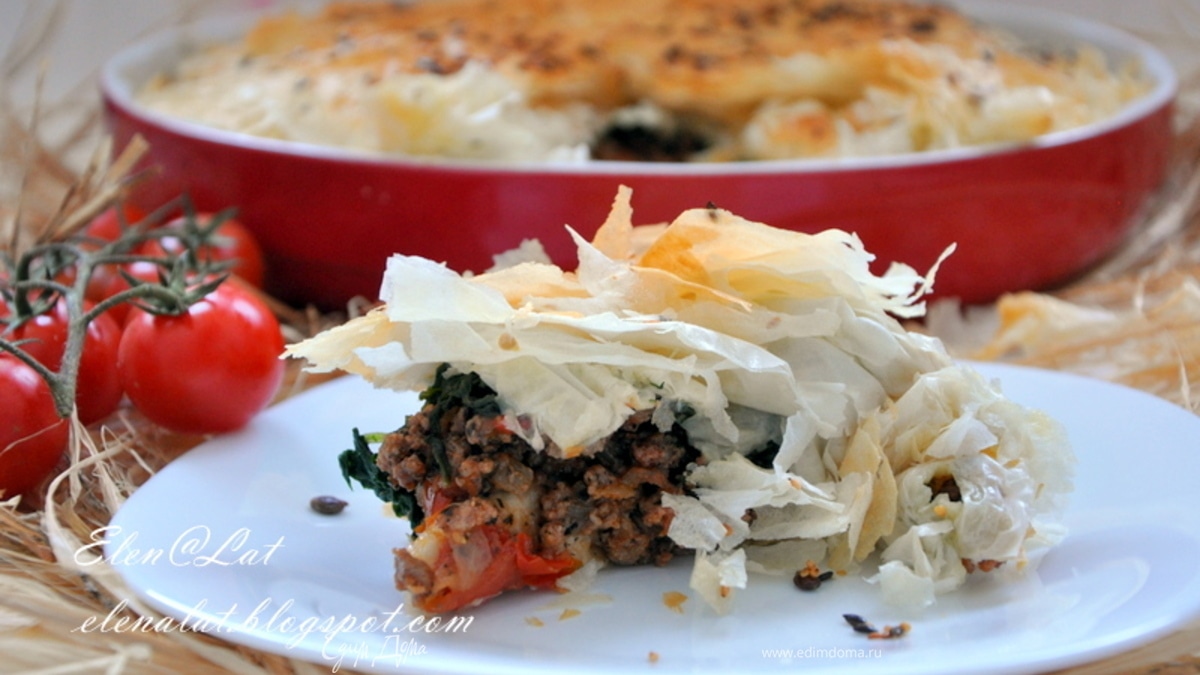 Пирог с бараниной, помидорами и тестом фило