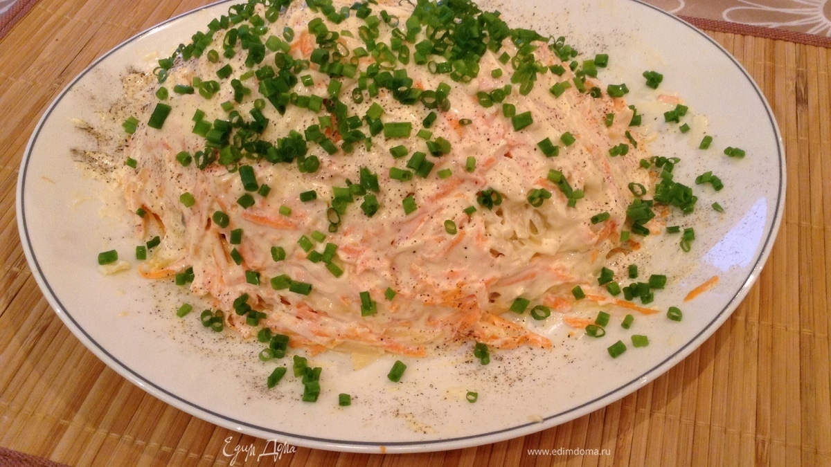 Уложите салат слоями: мясо, затем морковь, тонкий слой майонеза, тертый сыр, обжаренные с луком грибы, морковь, сыр и майонез.