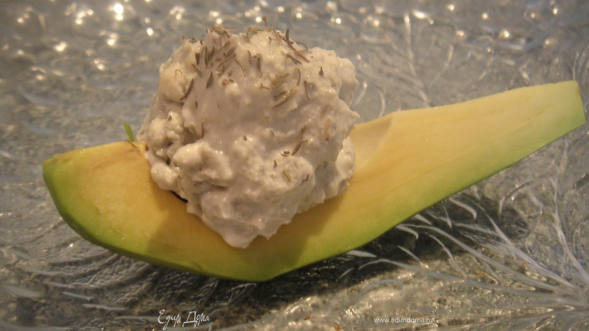- Шаг 1Сыр нарезать небольшими пластинами, положить в миску и раскрошить вилкой. Смешать с размягченным сливочным маслом, влить вино и перемешать. Тимьян мелко нарезать (если используете свежий) или измельчить в ступке (если используете сухой) и добавить к сыру. Добавить сметану и тщательно перемешать полученную массу. Авокадо разрезать пополам, удалить косточку. очистить половинки от кожицы и сбрызнуть со всех сторон соком лимона. Разрезать каждую половинку авокадо пополам, на полученные четвертинки выложить порциями сырную массу и подавать.