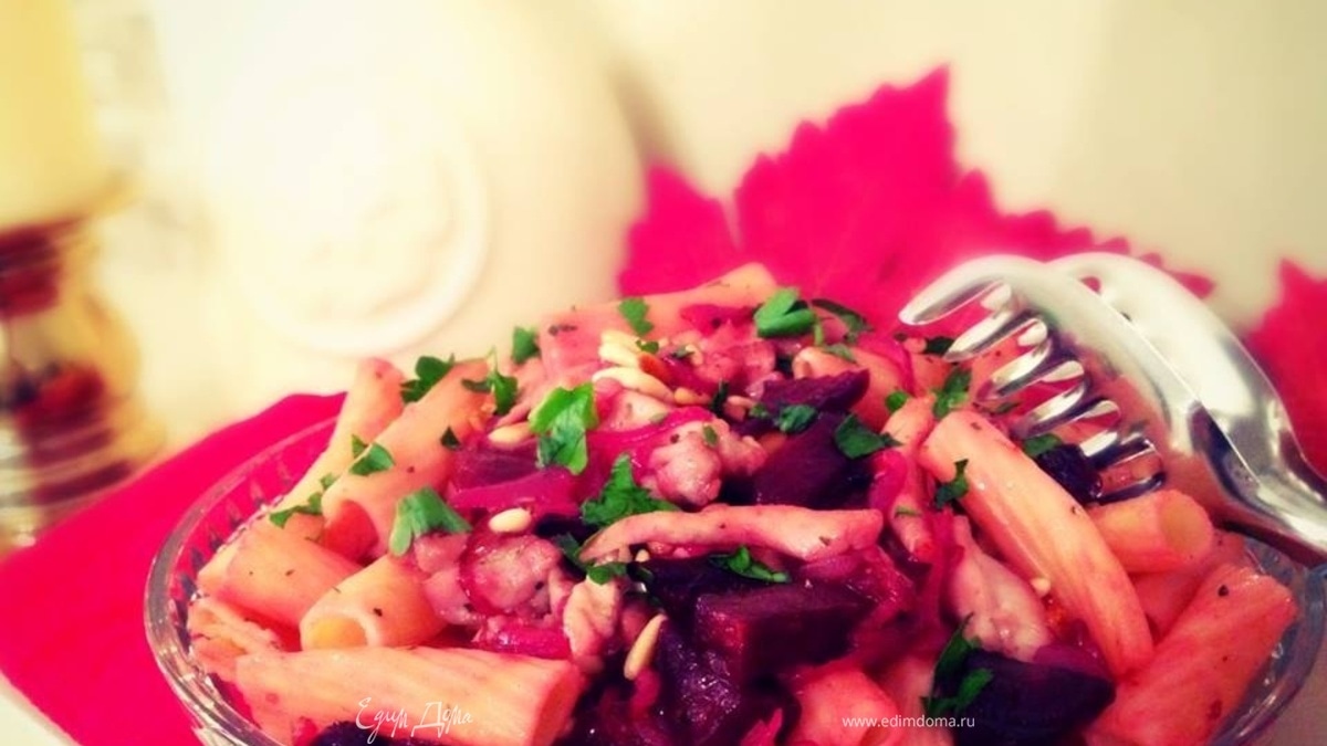 Салат с пастой, печеной свеклой, курочкой и кедровыми орешками