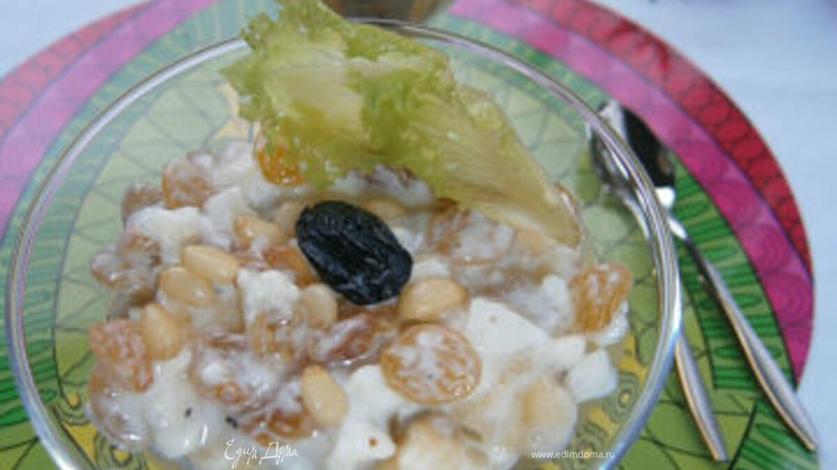 - Шаг 2 Изюм промыть, обсушить и добавить в салат, посолить по вкусу и заправить йогуртом, перемешать. Готовый салат украсить кедровыми орешками. Вкусный и оригинальный салат готов! Приятного аппетита!