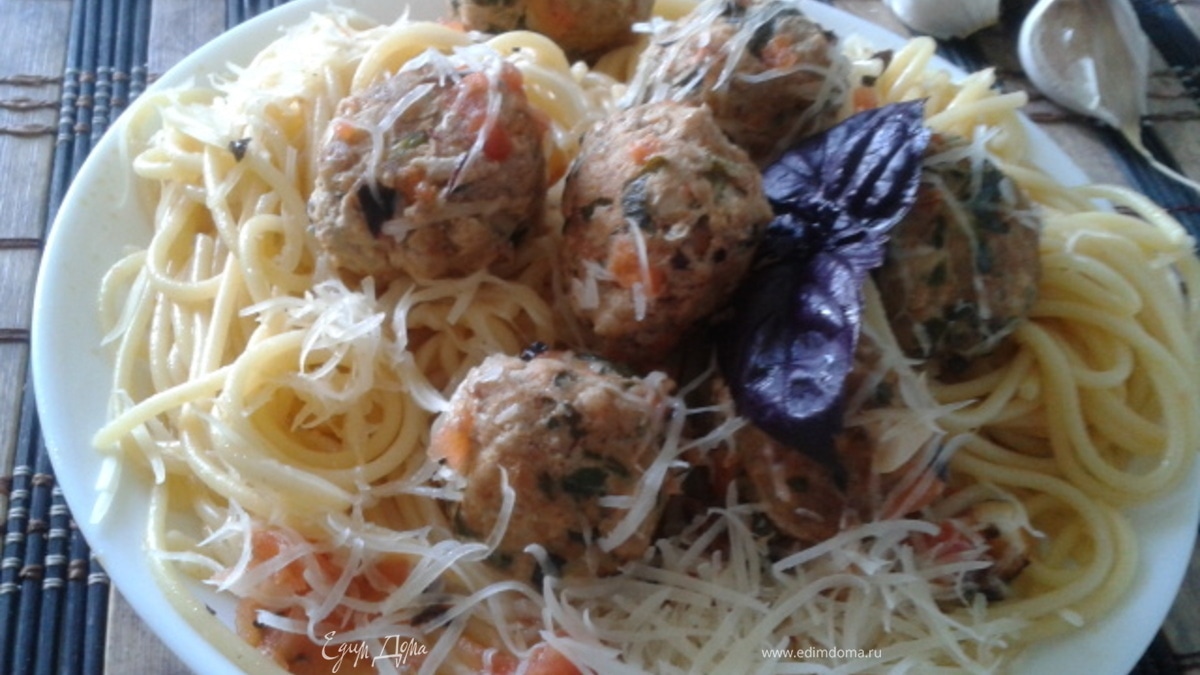 С помидор снять шкурку (ошпарив кипятком), измельчить помидоры и чеснок. Обжарить чеснок на оливковом масле, добавить к нему томаты, базилик, соль, сахар, перец. Дать соусу увариться в течение 7 мин. Фрикадели выложить в томатный соус и тушить 15 мин. - Шаг 4В подсоленной воде отварить спагетти. Готовые спагетти выложить к соусу, добавив половник воды, в которой они варились. Перед подачей посыпать тертым пармезаном.