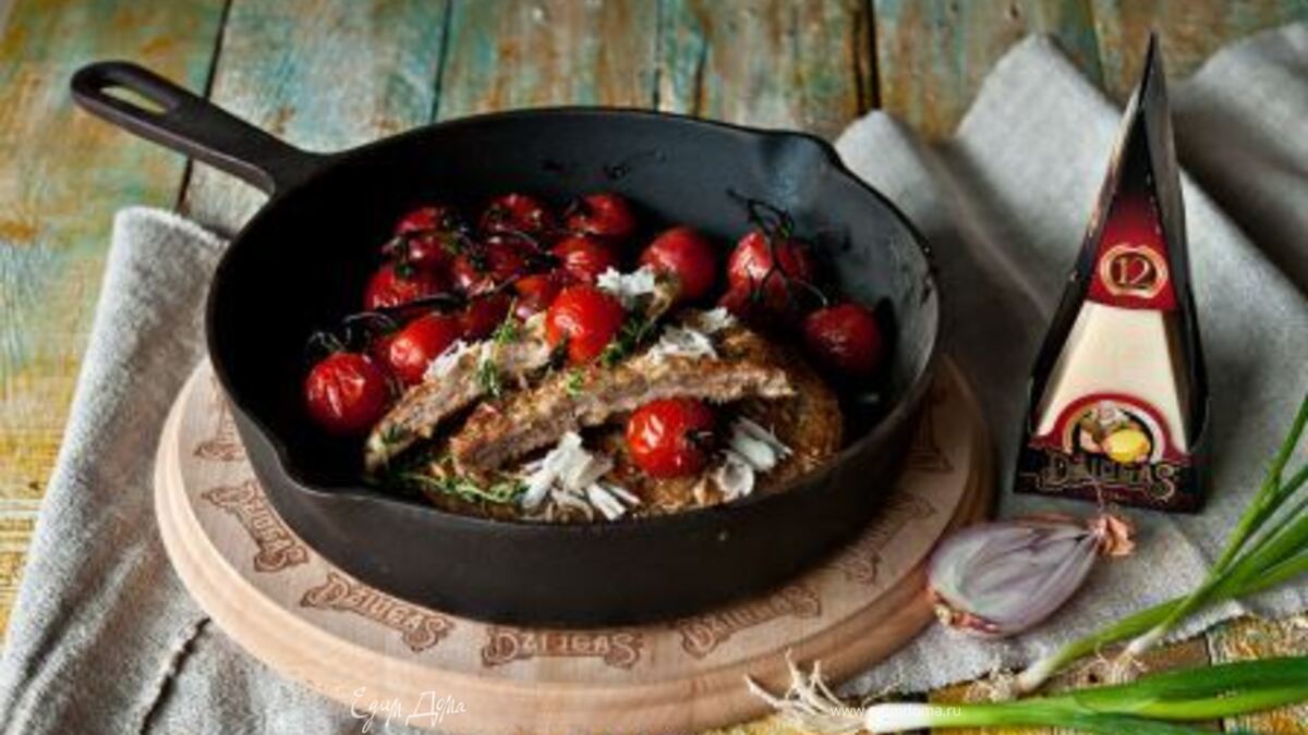 Тем временем обжарьте мясо в хорошо разогретой сковороде на оливковом масле с двух сторон до золотистого цвета. Обжаренную телятину переложите к помидорам и уберите в духовку еще на 2-3 минуты. Подавайте отбивные из телятины с печеными помидорами, присыпав хлопьями сыра Джюгас.