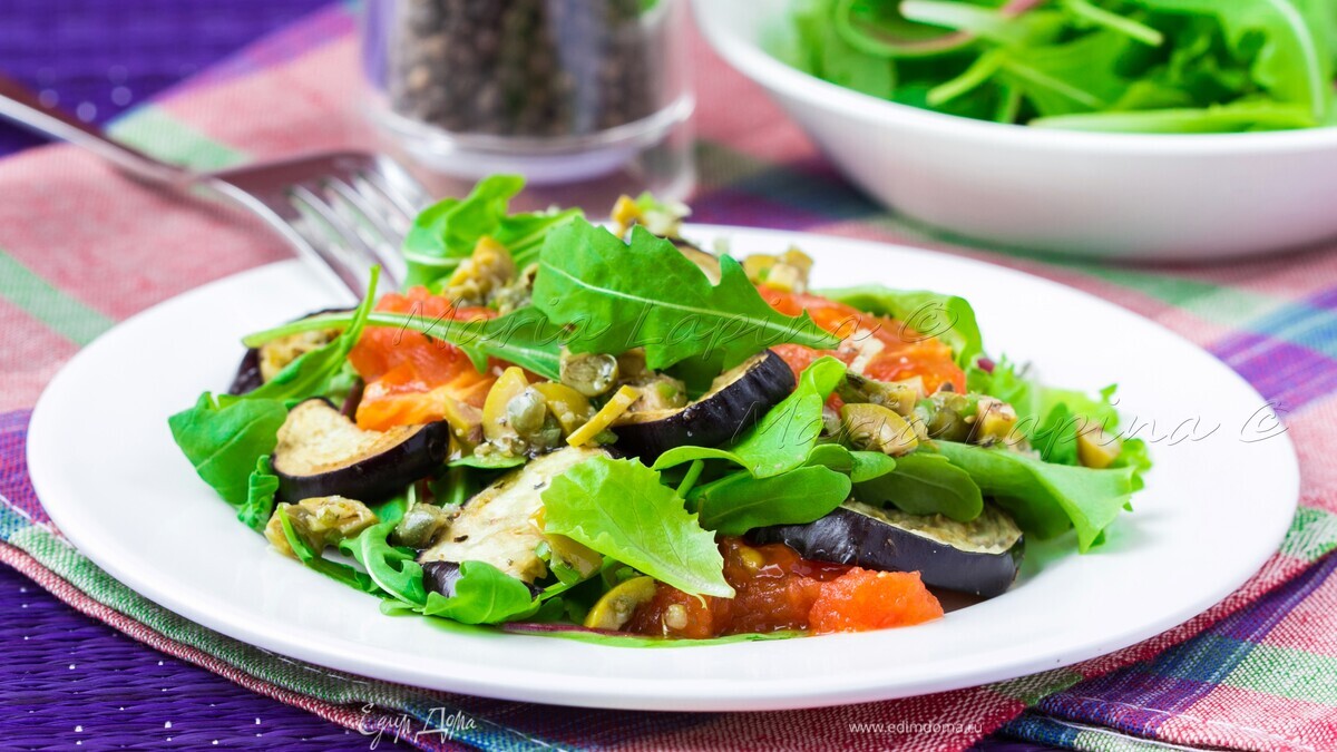 Теплый салат в итальянском стиле собрал в себе все самое вкусное! Тут и сочный томат, и богатый баклажан, каперсы, оливки, масло, чеснок - все ингредиенты отлично сочетаются и создают сумасшедший аромат и вкус! И готовится просто и быстро.