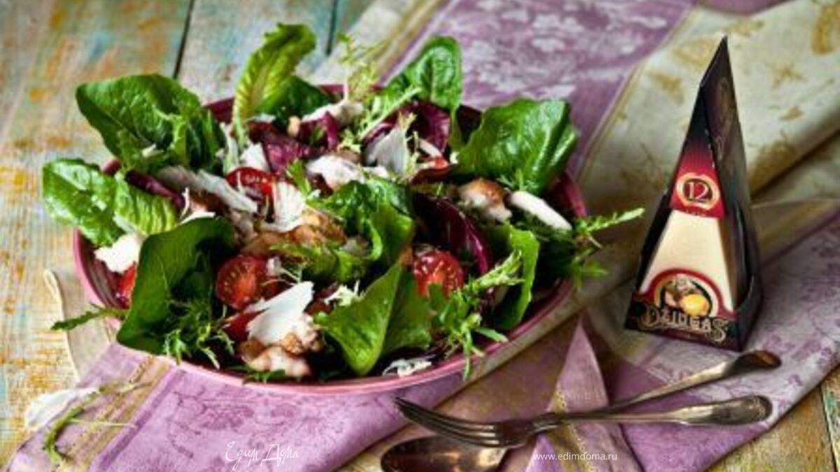 - Шаг 3Листья салата смешайте с половинками помидоров черри, хлопьями сыра, ломтиками курицы и бекона. Заправьте соусом, перемешайте и подавайте.