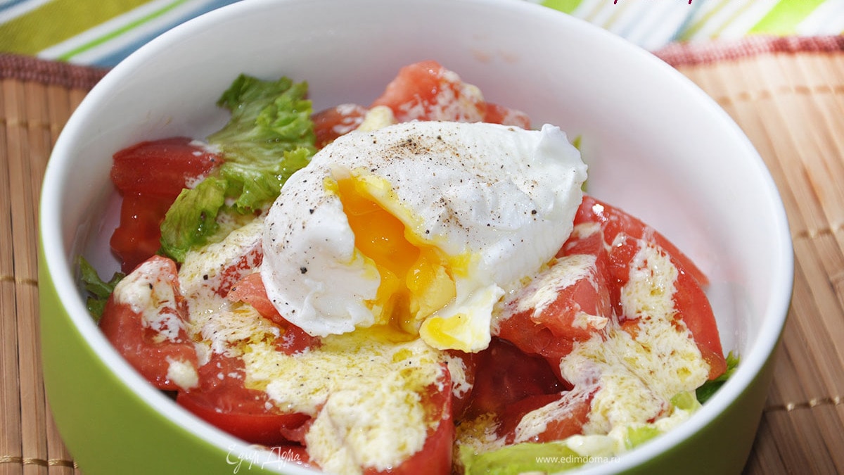 - Шаг 1Сварить яйцо пашот. Для этого закипятить воду в кастрюле, добавить уксус (столовая ложка на пол-литра воды). Уменьшить газ, чтоб вода не кипела. Аккуратно вбить яйцо. Варить 4 минуты. Вытащить шумовкой в холодную воду секунд на 10-20. Выложить на салат, посолить и поперчить.