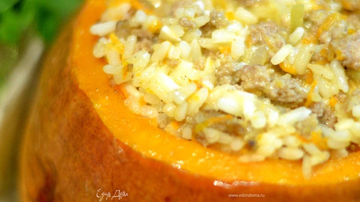Запеченная тыква, фаршированная рисом и фаршем