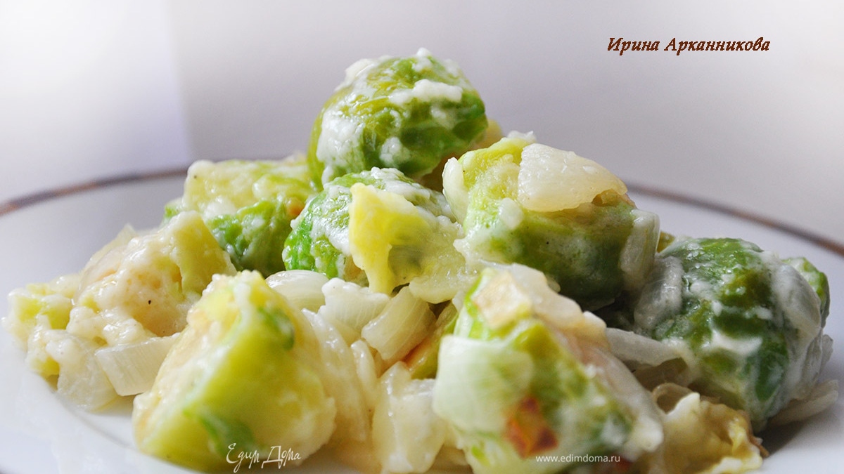 Брюссельскую капусту отварить в течение 5 минут. Лук крупными ломтиками или кубиками обжарить слегка на оливк. масле. Добавить разрезанную на четвертинки капусту. Залить соусом Бешамель и обжарить пару минут.