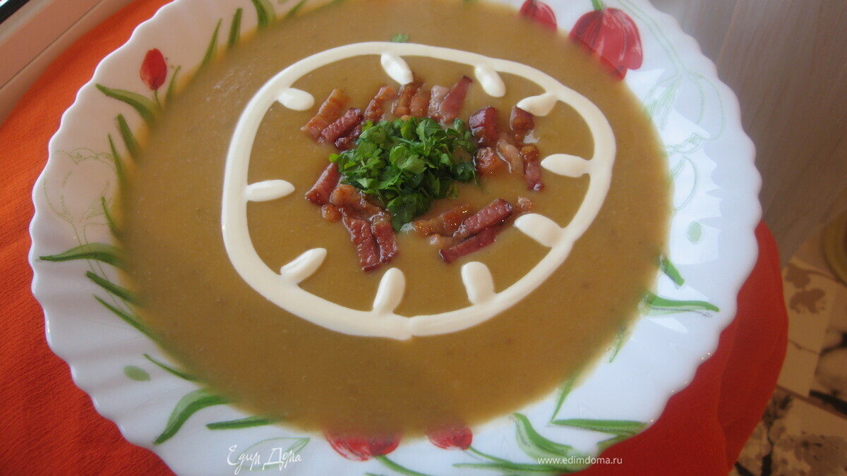 Бекон обжарить на сухой сковородке - Шаг 6Подавать с беконом, зеленью и сметаной.