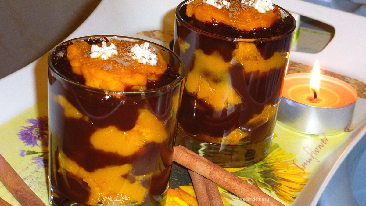 Стеклянные стаканчики поочередно заполняем тыквенным пюре и шоколадом. Готовый десерт можно украсить взбитыми сливками и измельченными орешками. Приятного аппетита!
