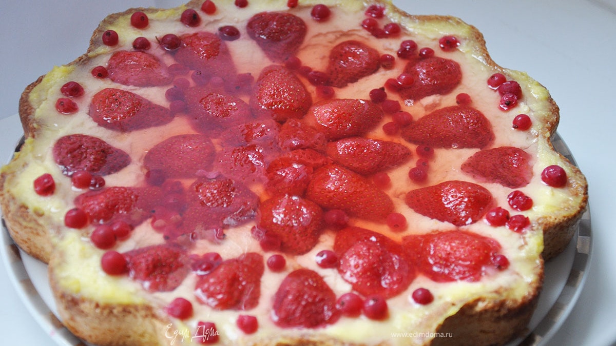 Остудить. Готовый крем выложить на корж. Крем разровнять лопаткой. пирог украсить ягодами. Залить пирог желе (приготовить по инструкции на пакетике) и убрать в хол-к на 2-3 часа минимум. На след. день бисквит еще нежнее и мягче.