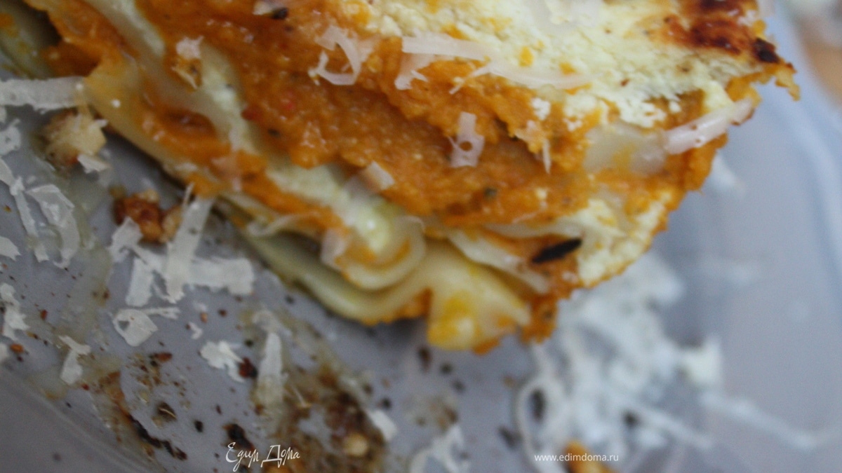 Смешать рикотту с яйцом, пармезаном, солью и перцем. В смазанную маслом подходящую по размеру форму для запекания положить листы лазаньи, сверху - половину тыквенного пюре, затем опять листы лазаньи, потом половину рикотты с пармезаном. Повторить все слои, завершив рикоттой и пармезаном. Накрыть фольгой и запекать 40 мин. Удалить фольгу и запекать еще 10-15 мин до образования румяной корочки. - Шаг 2
