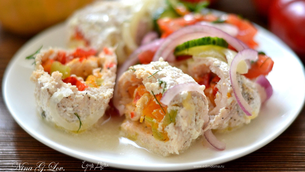 Куриные крученики, фаршированные тыквой, разноцветным перчиком и сыром