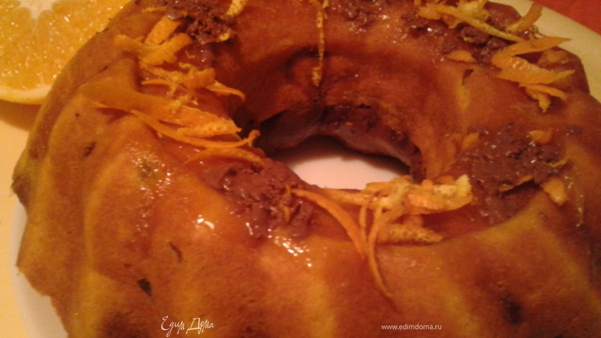Даем кексу чуть остыть, и поливаем его карамелью, сверху украшаем шоколадом и цедрой апельсина.