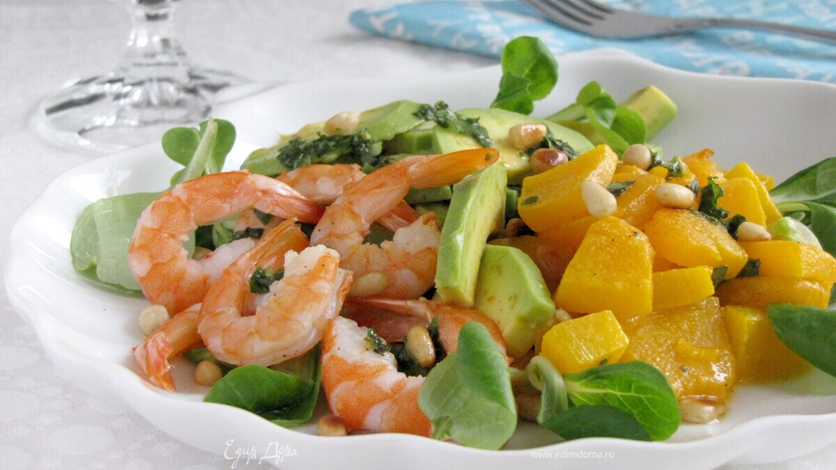 Необычайно вкусный, освежающий салат из тыквы, авокадо и креветок с мятно-базиликовой заправкой, кедровыми орешками