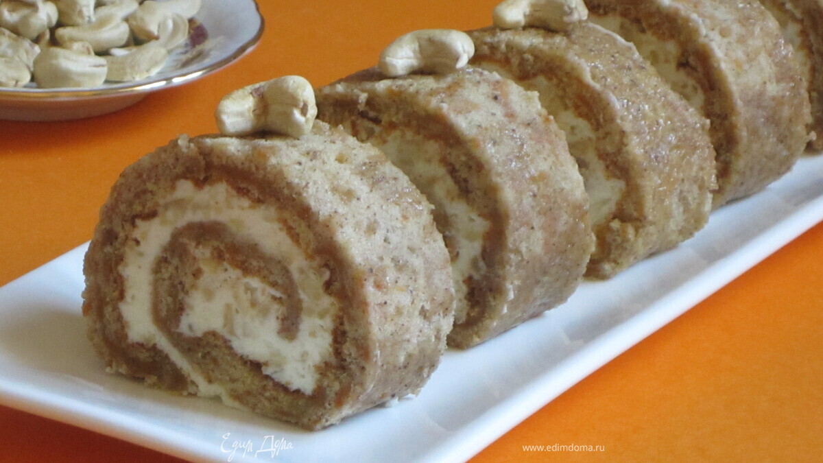 Интересный вариант рулета. Нежный сливочный крем с добавлением орехов кешью подчеркивает вкус коржа с добавлением корицы.