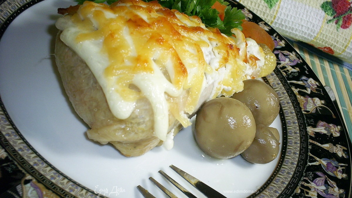 Заключительный штрих - посыпаем наши заготовки натертым сыром и запекаем в разогретой до 200 градусов духовке приблизительно 30 минут. Окорочка должны зарумяниться, а при прокалывании кожицы сок должен быть прозрачным.
