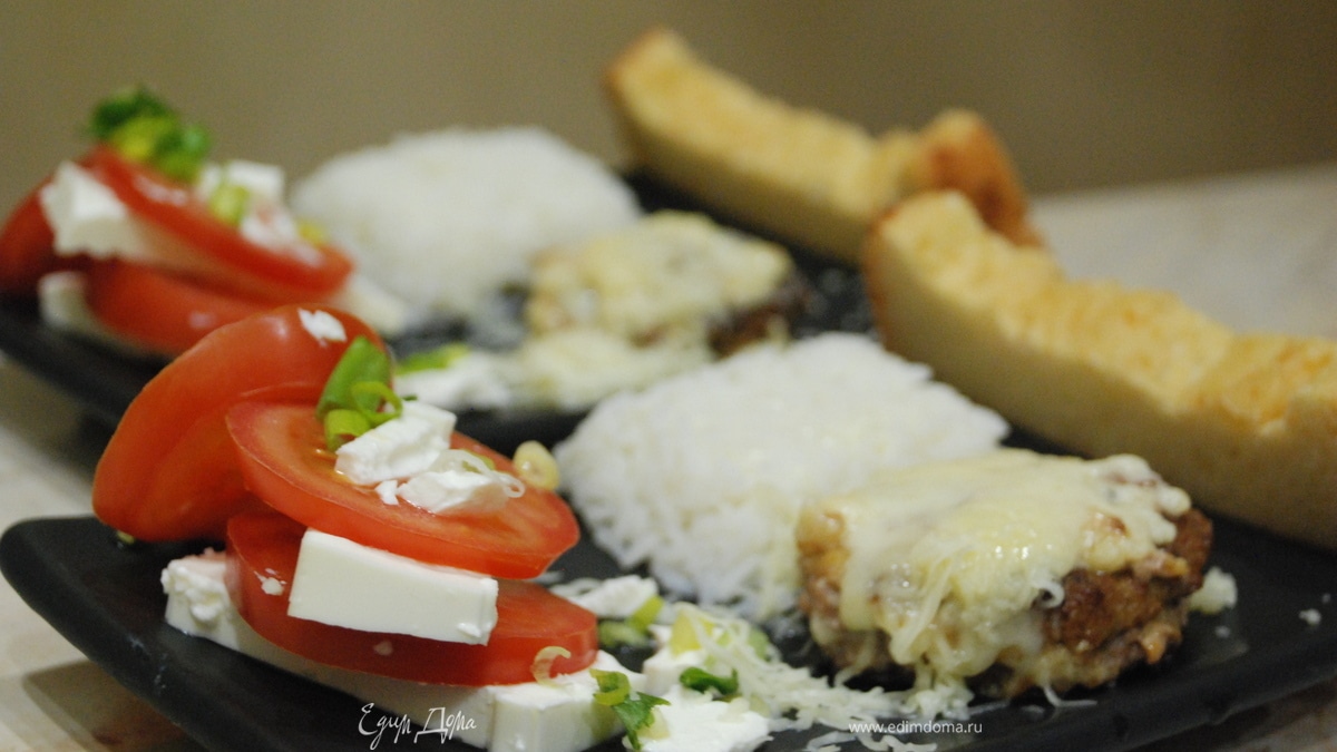 - Шаг 3Готовим сервировку. Салат из брынзы и помидоров. Режем пластами брынзу и помидоры и укладываем слоями. Добавляем мелко нарезанный зеленый лук, листочки мяты и поливаем оливковым маслом. Сервируем тарелку рисом (при готовке не солите сильно, чуть-чуть для аромата, потому что брынза и моцарелла и так достаточно соленые). Выкладываем готовую котлетку. Она должна быть мягкой. И сверху присыпаем моцареллой. Добавляем маленький штрих в виде домашнего хлеба. Приятного аппетита!