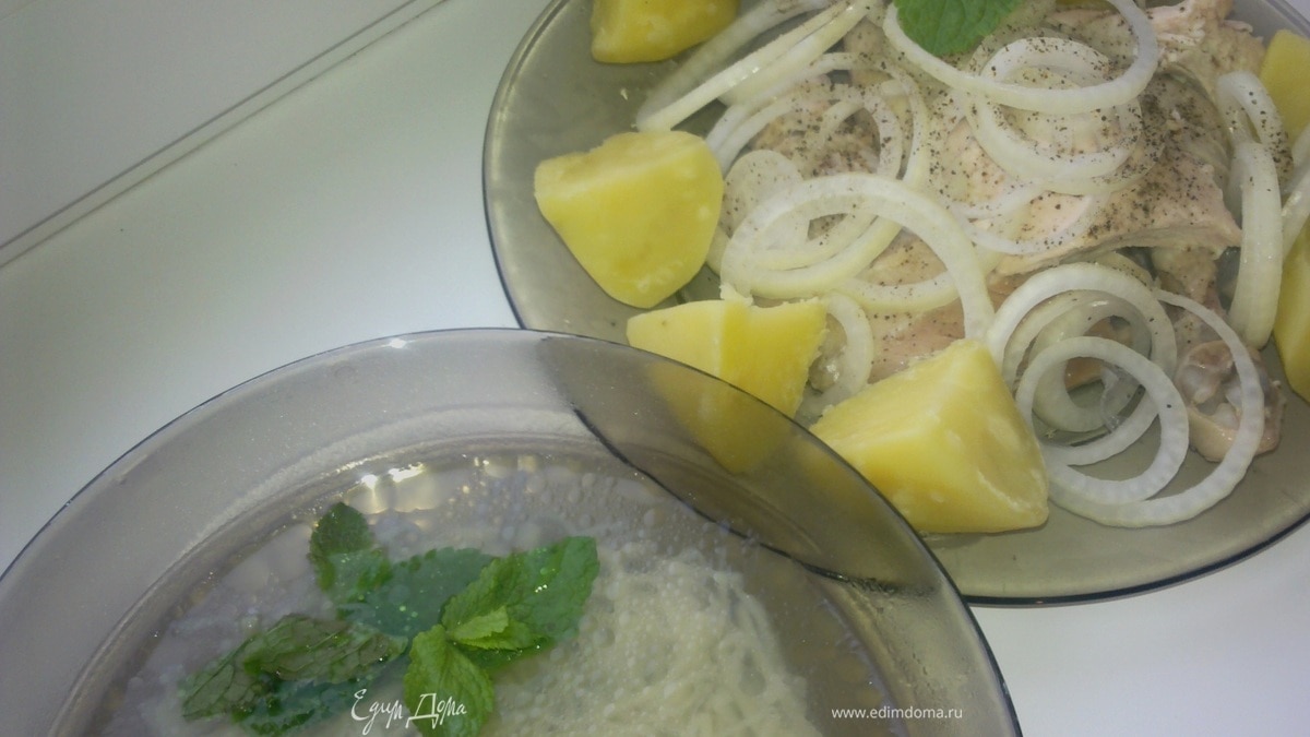 - Шаг 10Пока варится лапша разделываем курицу, выкладываем ее в отдельное блюдо вместе с картофелем, сверху кладем нарезанный кольцами лук и перчим. Ну и все, накладываем суп в тарелки и добавляем каждому по вкусу мяту.