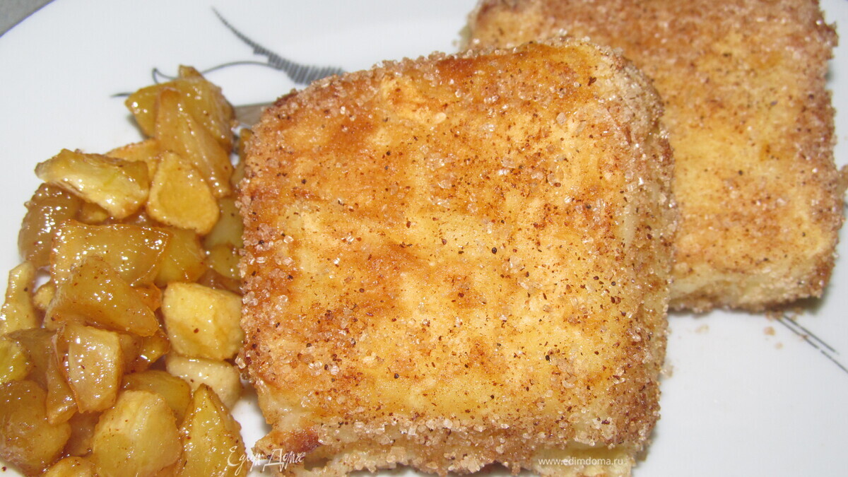 Разрезать на квадратики. Взбить яйцо. Квадратики обвалять в муке, потом в яйце и опять в муке. Обжарить. Выложить на бумажное полотенце. Обвалять в смеси корицы с сахаром.
