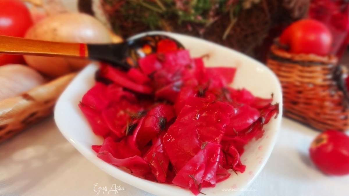 Капуста получается острой и хрустящей, красивого гранатового цвета, пряные травы придают особый вкус и аромат всем овощам. Хорошо подходит салат к мясным блюдам и опять же яблочный или винный уксус очень деликатны в мариновании, в сочетании с пряностями дают восточный колорит нашей обычной капусте.
