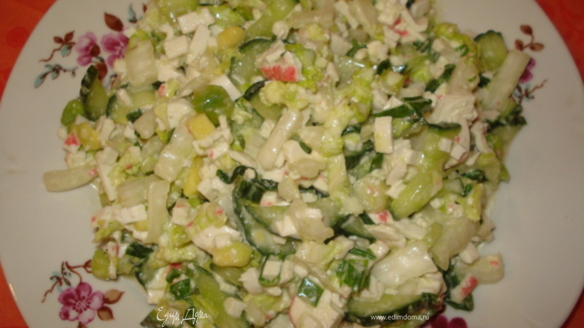 - Шаг 1Нарезать соломкой 4 листа пекинской капусты, затем свежий огурец тоже соломкой. Очистить от кожуры и положить мелко нарезанную половинку авокадо. Добавить нарезанные по-возможности соломкой крабовые палочки,(отварные и почищенные креветки) зеленый лук. Заправить напополам майонезом и сметаной. Посыпать свежим укропом.