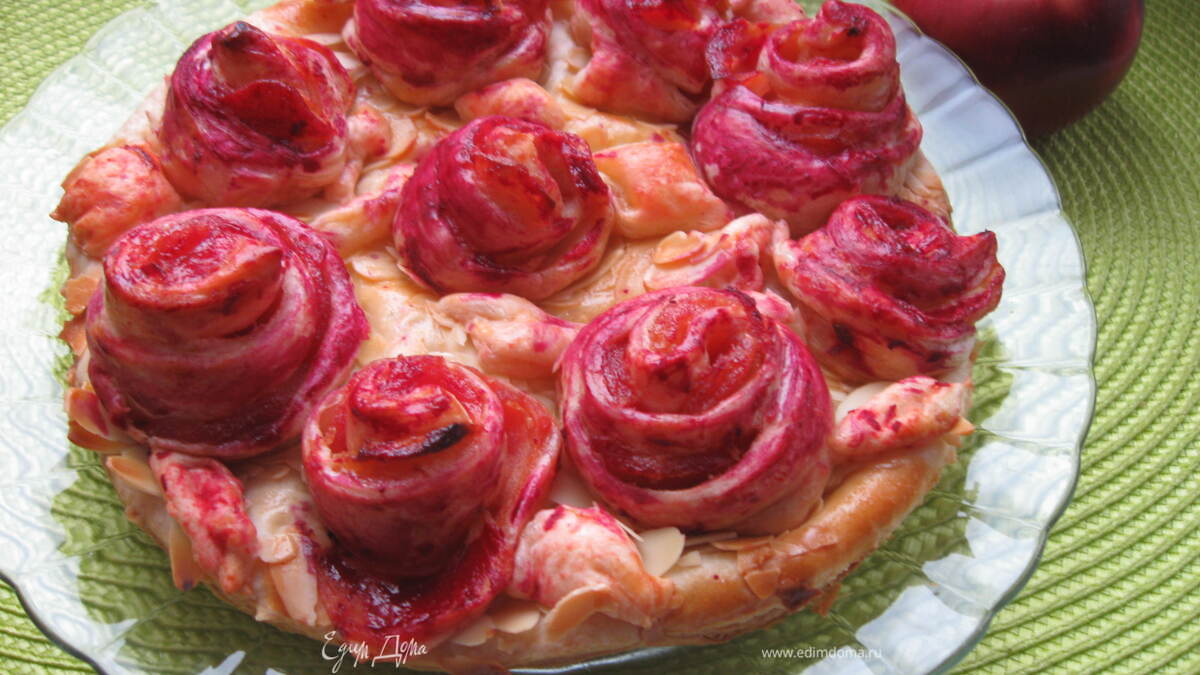 Тесто раскатать и из части его вырезать круг диаметра формы, из другой части нарезать длинные полоски шириной 2 см, смазать кисточкой с двух сторон небольшим количеством свекольного сока, положить яблочные ломтики на полоски теста вдоль, скрутить розочки. Основу теста положить в смазанную маслом форму. Яйцо взбить венчиком, слегка смазать тесто. Посыпать миндальными лепестками. Сверху выложить розочки, кисточкой смазать яйцом розочки. - Шаг 2
