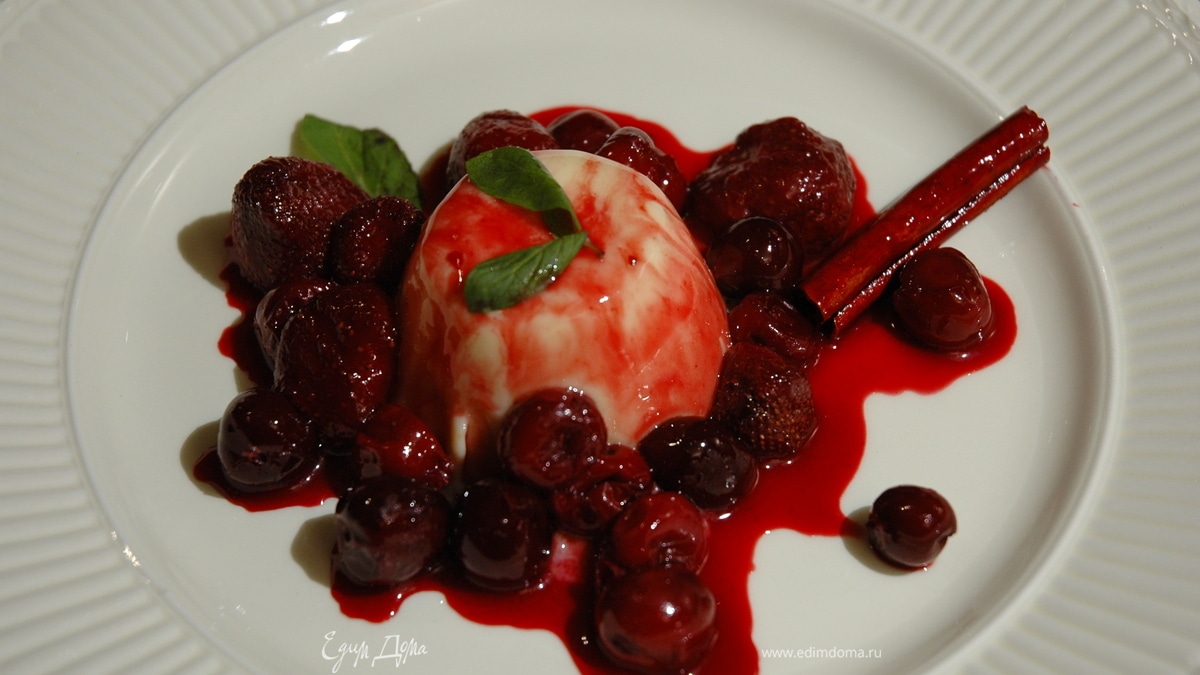 Приготовить соус: половину клубники и вишни отправить в сковороду, добавить 100 г сахара, палочку корицы и уварить все до состояния густого соуса. Для взрослых оставшуюся клубнику и вишню тоже отправить на сковороду, добавить 100 г сахара, влить ром и поджечь. - Шаг 7