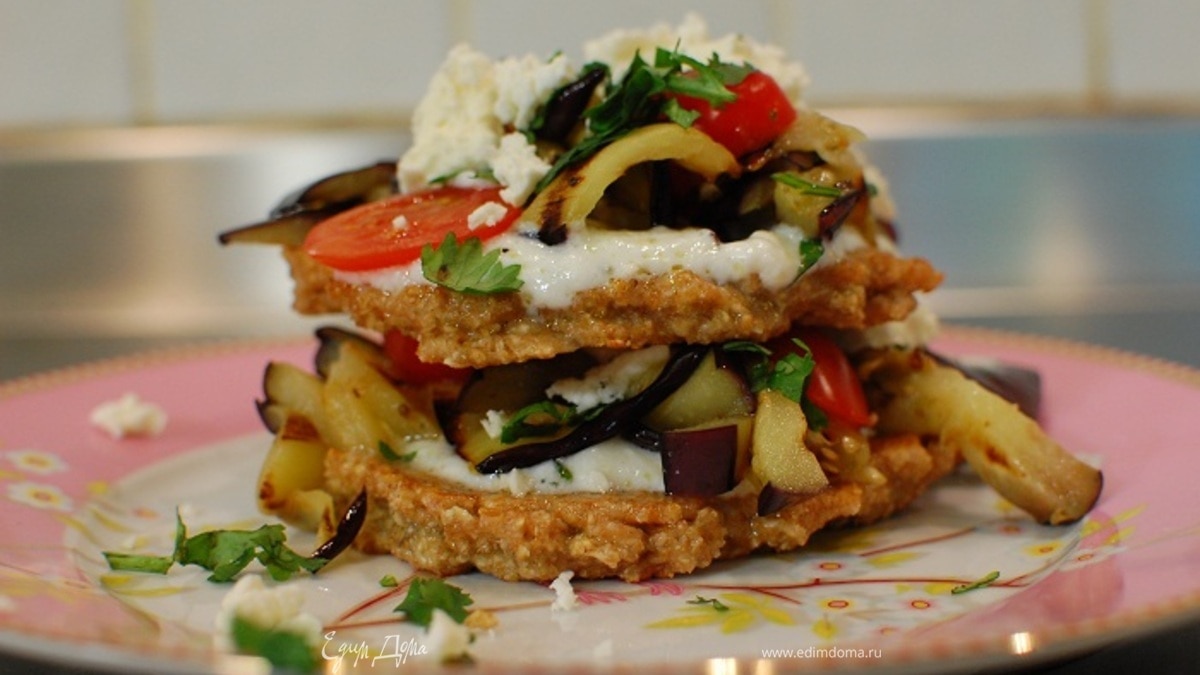 Башенка из овсяных оладий, баклажана и феты