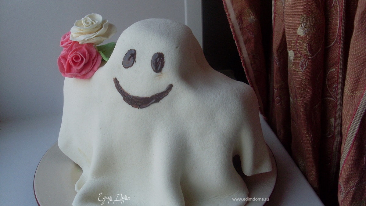Идея приготовить тортик "Привидение" на Хэллоуин пришла ко мне после приготовления самодельного зефира машлеллоу и мастики из него (рецепт Евы, спасибо ей огромное). Мастика получилась очень постушная, пластичная, мне было интересно, как она ляжет на вертикально установленную фигурку. Оказалось, что в интернете есть несколько вариантов такого торта, от одного из них (вертикального) я и отталкивалась. В этом рецепте бисквит может варьироваться (в оригинале - апельсиновый бисквит на 4 яйцах), я взяла за основу бисквит шоколад на кипятке (готовила по рецепту Оксанки, получился со второго раза, - обязательно нужен хороший разрыхлитель, а так прекрасный бисквит, очень вкусный и воздушный, сочный, еще я масло добавила не растительное, а сливочное - вообщем моя признательность автору рецепта). У меня мастика не совсем белоснежная, т.к. в зефир я добавляла ванильный сахар с кусоками ванили. Так как у нас Хэллоуин протекает в "мягкой форме" - детки еще маленькие и пугаться не любят, то привидение у меня доброе - улыбается и с букетиком мастичных розочек (та же мастика, только подкрашенная).