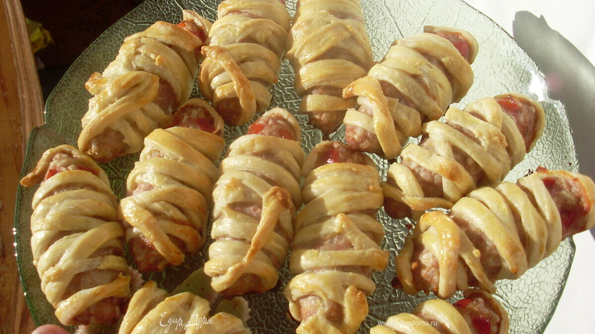 Обернуть каждую колбаску тонкими полосками теста, чтобы было похоже на мумий - сделать шапочку, оставить открытыми "глаза", само тесто наматывать с перекрестами - так больше похоже. Оставить мумий при комнатной температуре - полностью разморозить. Проверить - проткнуть зубочисткой самое толстое место мумии.