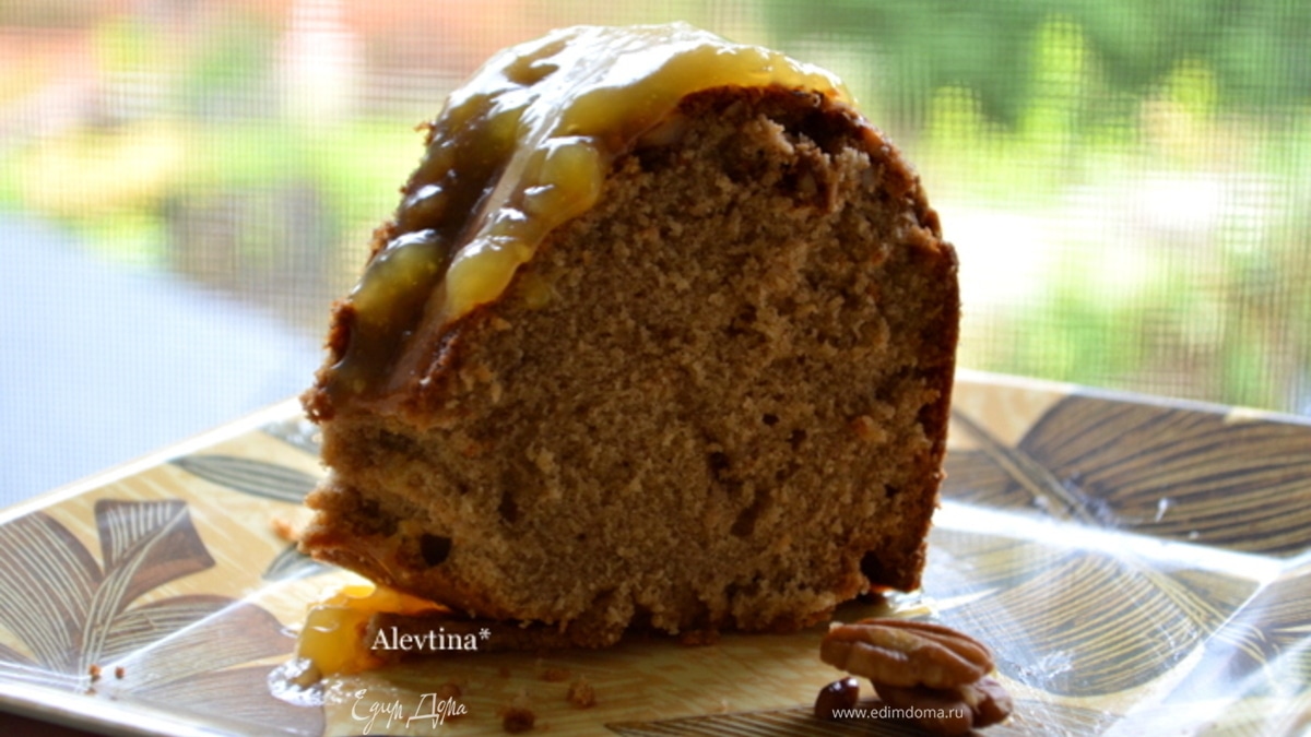 Поливаем кекс поверх готовым соусом. Разрезаем и подаем к столу. Наслаждаемся богатым вкусом.