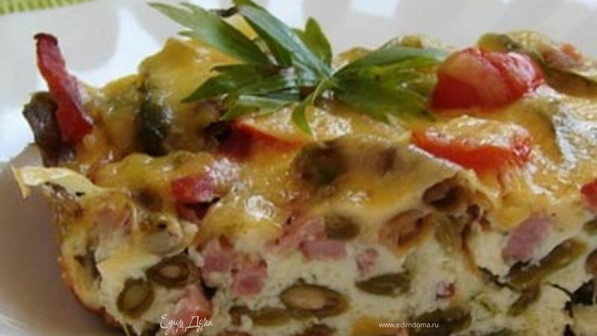 - Шаг 4Полученной яичной массой залить фасоль с ветчиной.