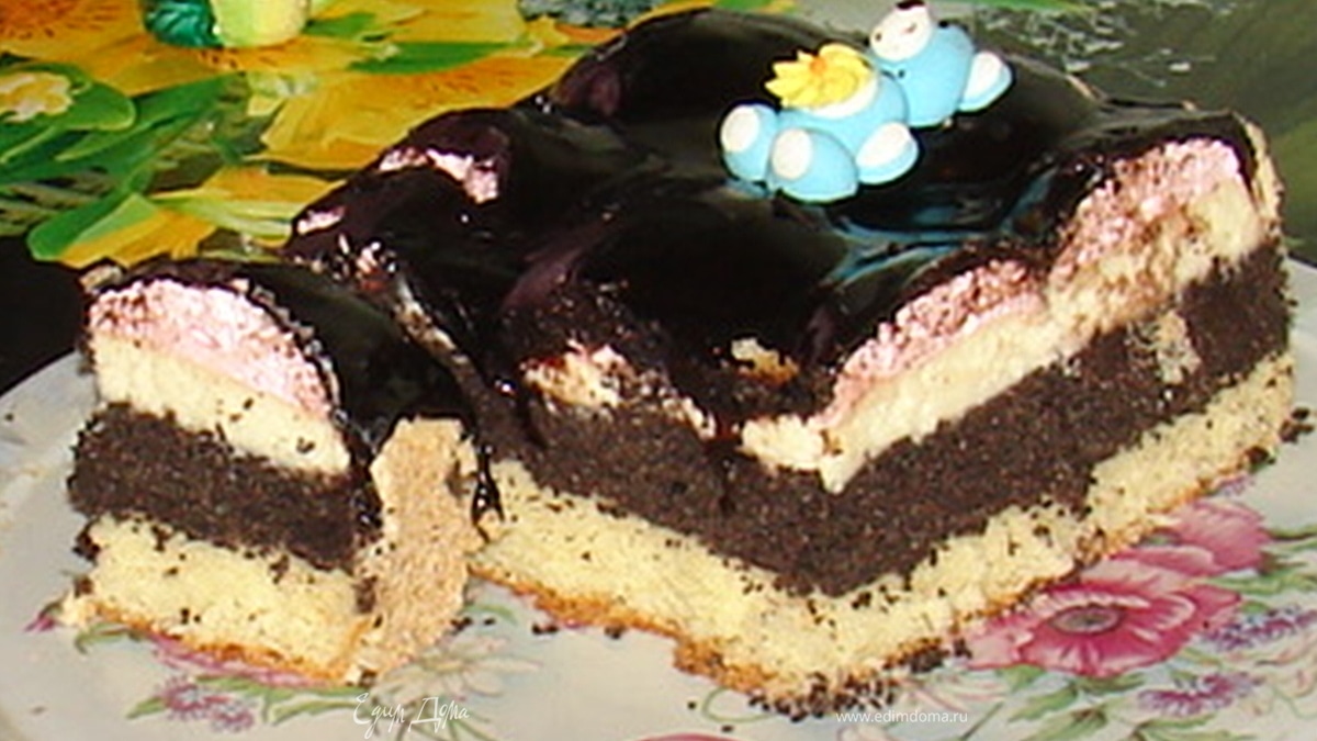 - Шаг 1Мак залить кипящей водой,варить10минут на медленном огне,потом накрыть и оставить на полчаса,чтобы он запарился.Потом мак процедить и перемолоть 2раза на мясорубке.К маку по очереди добавлять:сахар,3 желтка,200гр масла,амоний,крохмаль,манную крупу.Все хорошенько перемешать.Напоследок добавить 3 взбитых яичных белка и осторожно все перемешать.Большую прямоугольную или квадратную форму выложить бумагой для выпечки,смазать маслом и распределить маковую массу.Выпекать 15-18минут при темп.190 С.За это время приготовить бисквит: желтки взбить с сахаром,просеять муку и разрыхл. и добавить ванильную эссэнсию.Белки взбить и соединить с бисквитной массой.На горячую маковую массу вылить бисквит и отправить в духовку еще на 18минут.Дождаться,пока корж остынет и перевернуть его так,чтобы мак был сверху. Крем:желтки растереть с сахаром,добавить манную крупу,перемешать и влить молоко.Варить до загустения на медл.вогне.Когда масса остынет,добавить масло,эссэнсию,коньяк и все хорошенько взбить.Крем равномерно распределить на маковую часть торта,на него выложить половинки зефира-ракушки и залить торт шоколадной глазурью.Бока торта смазать кремом и обсыпать кокосовой стружкой или сухарями. В последнее время к крему я добавляю 250-300гр творожной массы,получается еще вкуснее.Объеденье!Попробуйте приготовить,не пожалеете.
